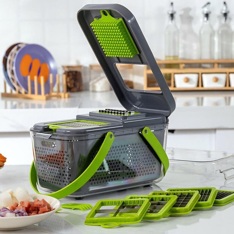 نایسر دایسر محصولی چند کاره می باشد که کار را در آشپزخانه برای شما سهل و آسان می کند. به کمک نایسر دایسر شما می توانید مواد را به قطعات یک شکل و یک اندازه در بیاورید که تاثیر زیادی در زیبایی و تزئین دارد. مثلا سیب زمینی سرخ کرده های یک اندازه و هم قطر یا سالاد شیرازی با خیار و گوجه های یک شکل و یک اندازه. نایسر دایسر فکر همه چیز برای تزئین و تهیه سالاد و خرد کردن مواد غذایی را کرده است. محصولی چند کاره : رنده ، خلال کن ، ورقه کن، خردکن ، قاچ کن ، مکعبی کن و غیره.شما تمام موادی که خرد شده اند را می توانید درون همان ظرف محصول که دارای درب چفت شونده هم می باشد درون یخچال نگهداری کنید. این محصول چند کاره تیغه های تیز از استیل ضد زنگ فقط به یک فشار دست شما نیاز دارند تا به راحتی میوه و سبزیجات را برای شما خرد کنند.